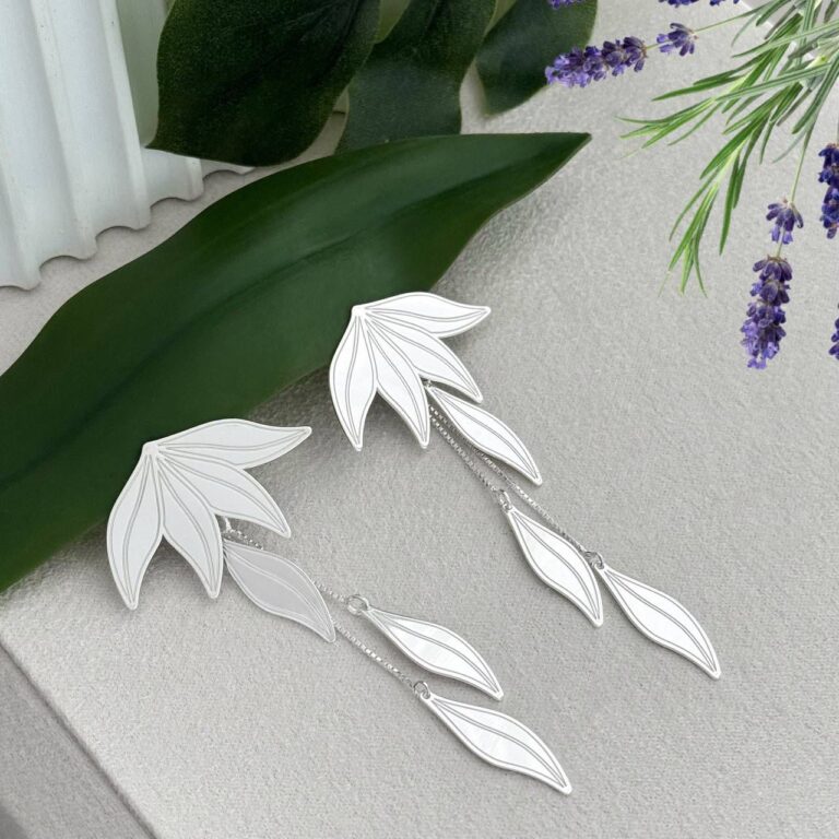 Suas correntes fluidas e folhagem estilizada criam um movimento único que alonga o rosto e traz um toque de frescor tropical.